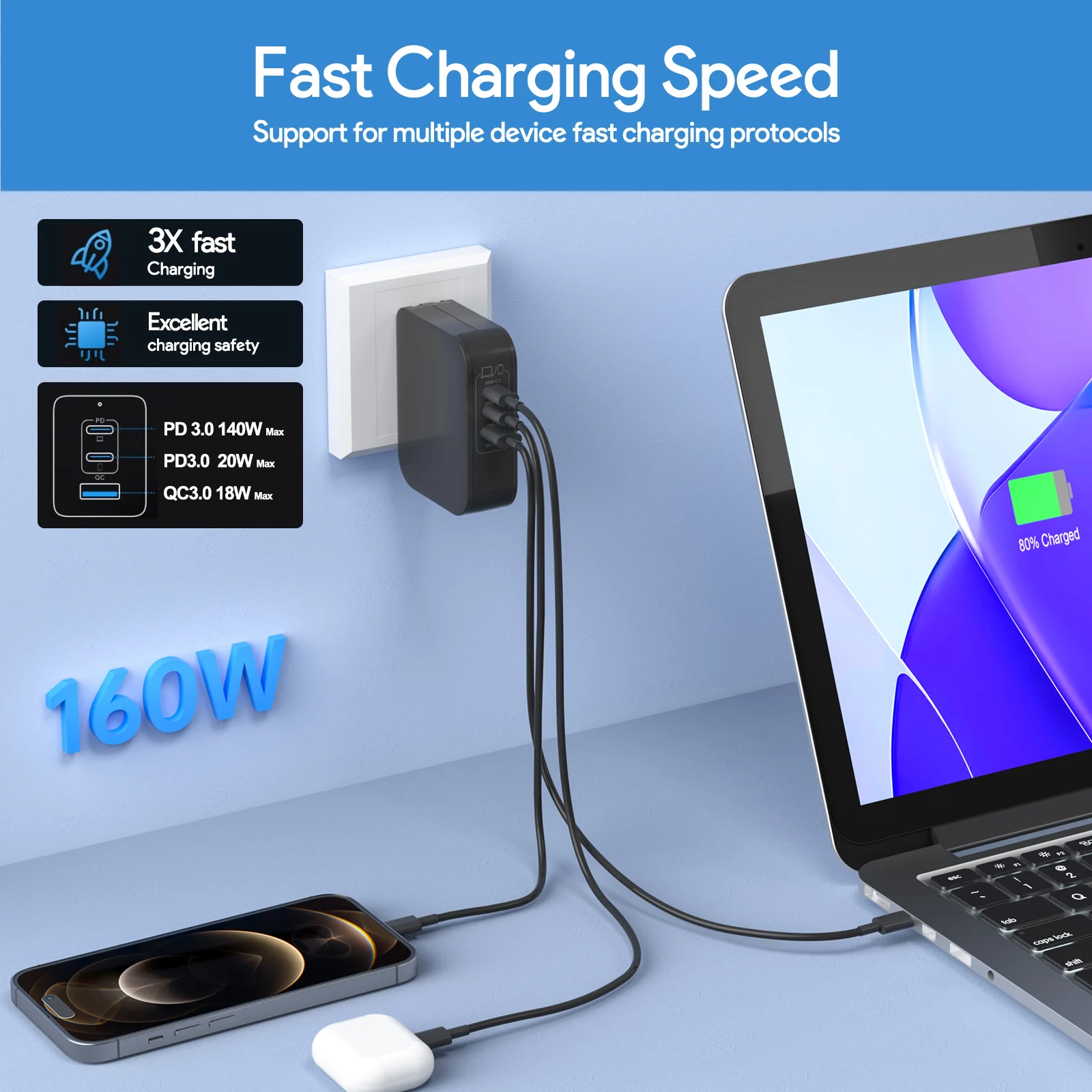 160W US/EU/UK Plug GAN Charger 2C+1A Laptop Charger Phone Device Charging Station for MacBook