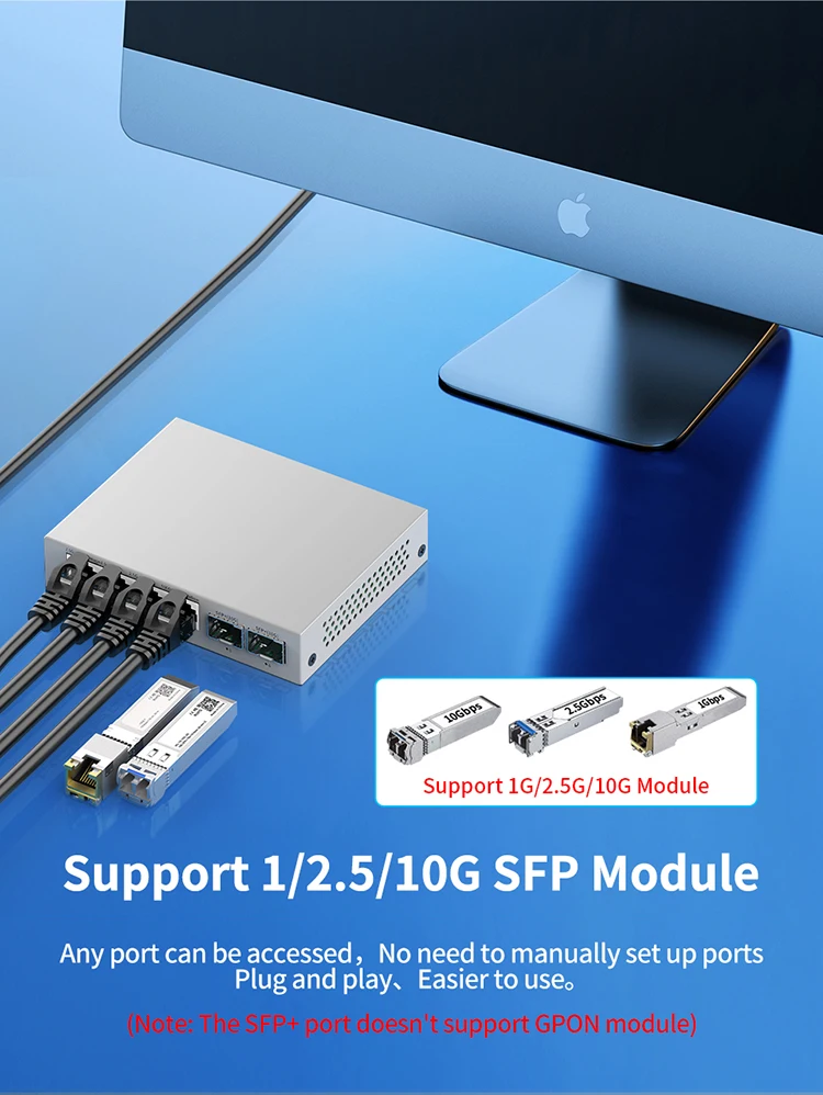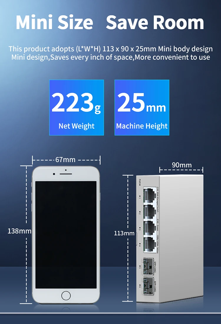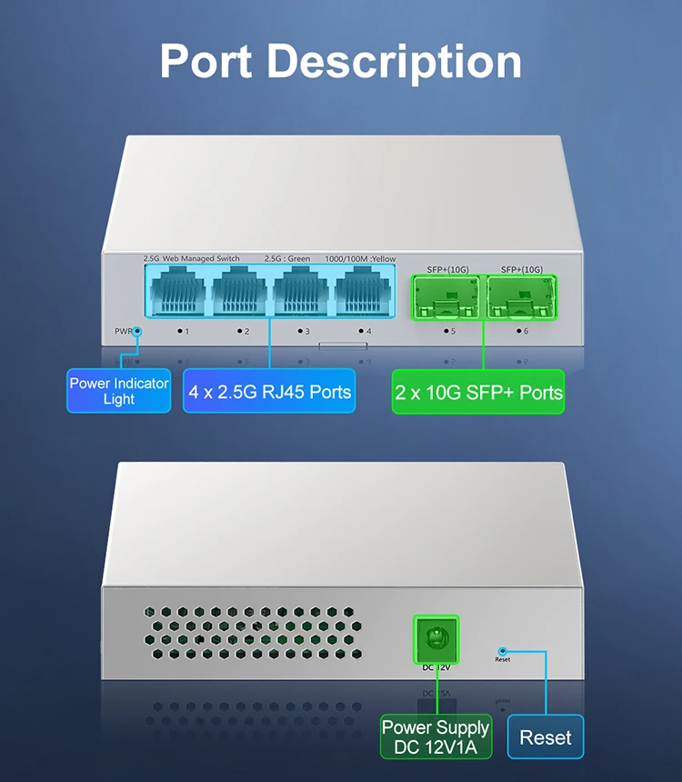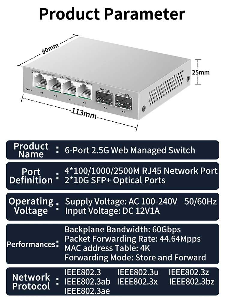 Ports:4*100/1000/2500M RJ45 ports, 2*10G SFP+ ports | Power:DC 12V 1A | Ports:6 |