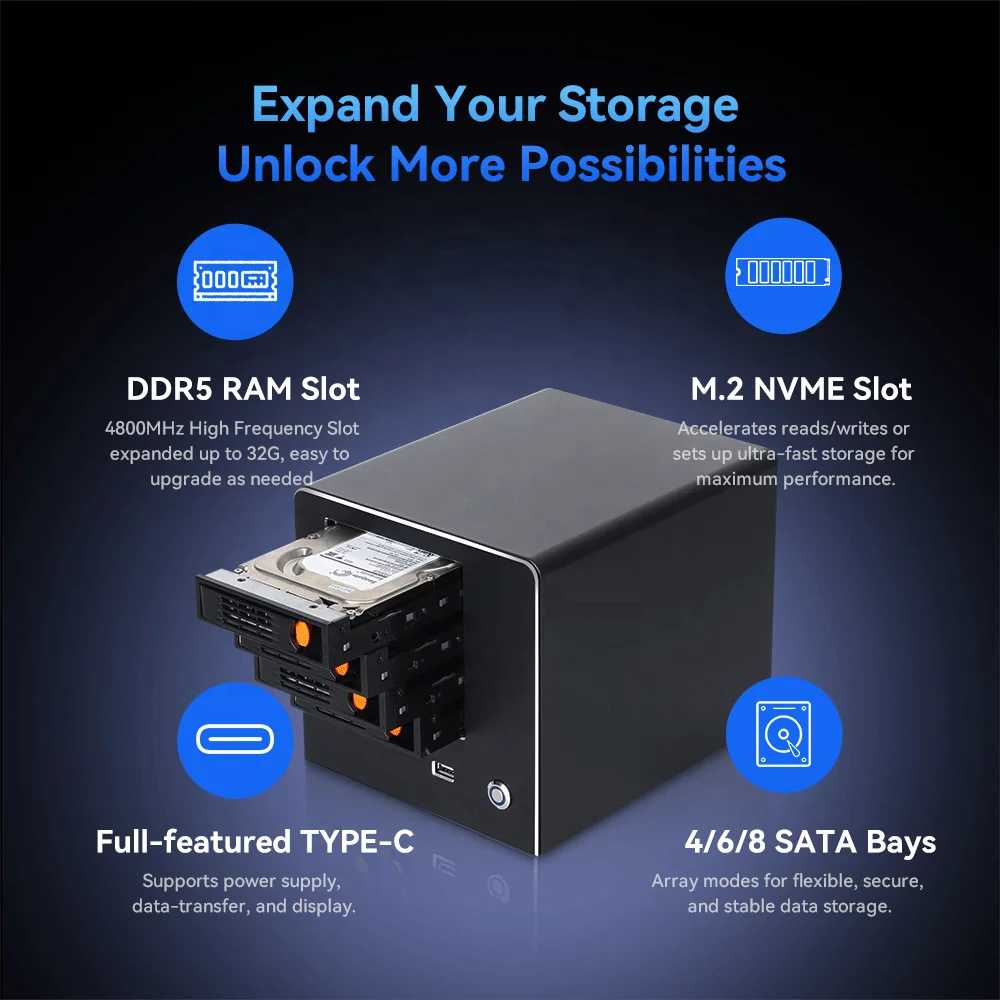 Ram Type:DDR3L, DDR5 | Dimension:231*192*186mm/245*220*255mm/315*310*210mm | SATA Bays:4/6/8 Bays for 2.5/3.5 inch SATA |