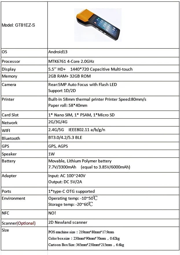 Network:2G/3G/4G | Printer:Built-in 58mm thermal printer Printer Speed:80mm/s Paper roll: 58*40mm | Card Slot:1* Nano SIM, 1* PSAM, 1*Micro SD |