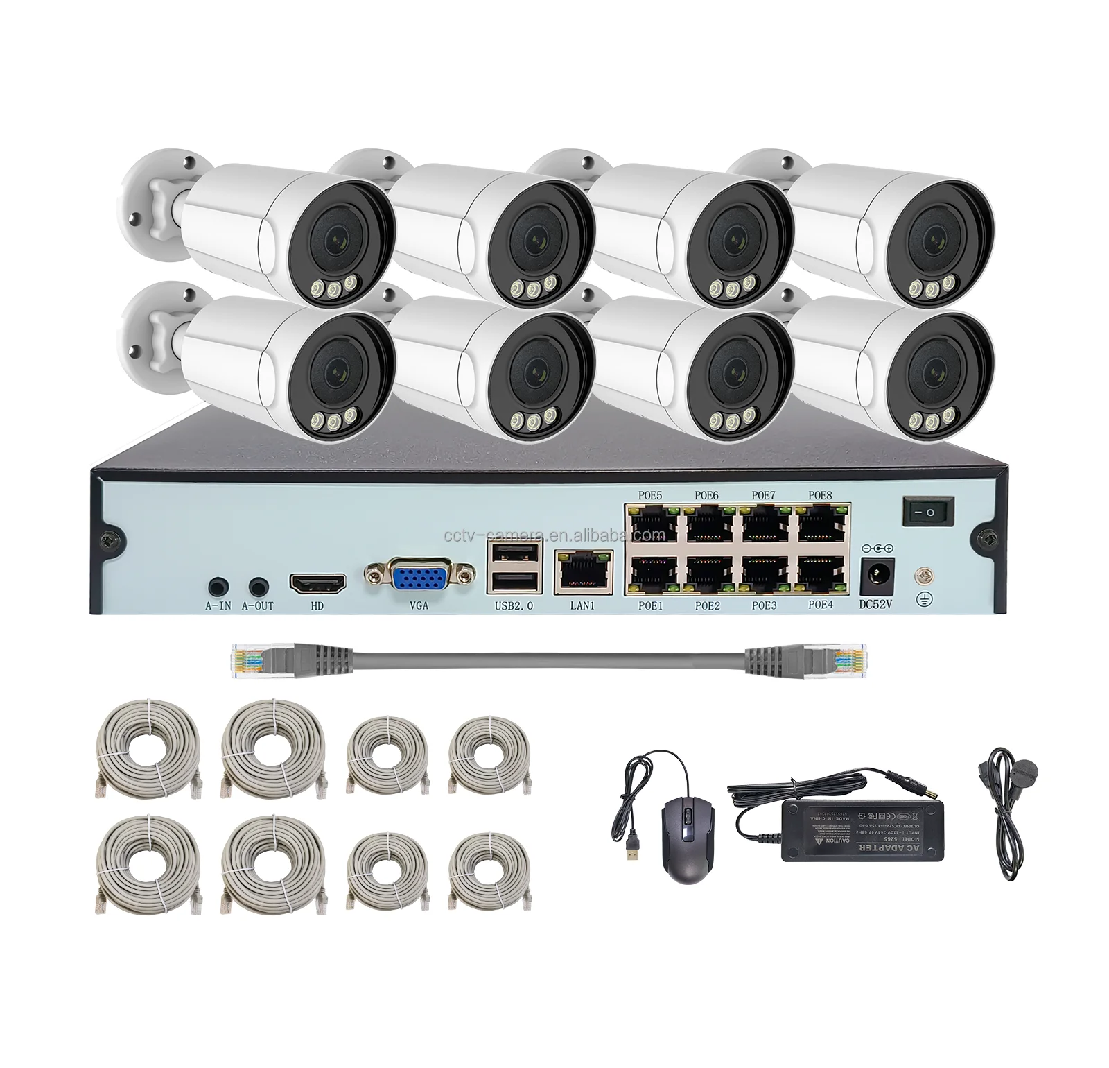 Dimension:255*210*42mm | IP Camera:8pcs *5MP PoE Bullet IP camera | LAN Cable:4pcs*15M,4pcs*25M,1pcs*1.5M |