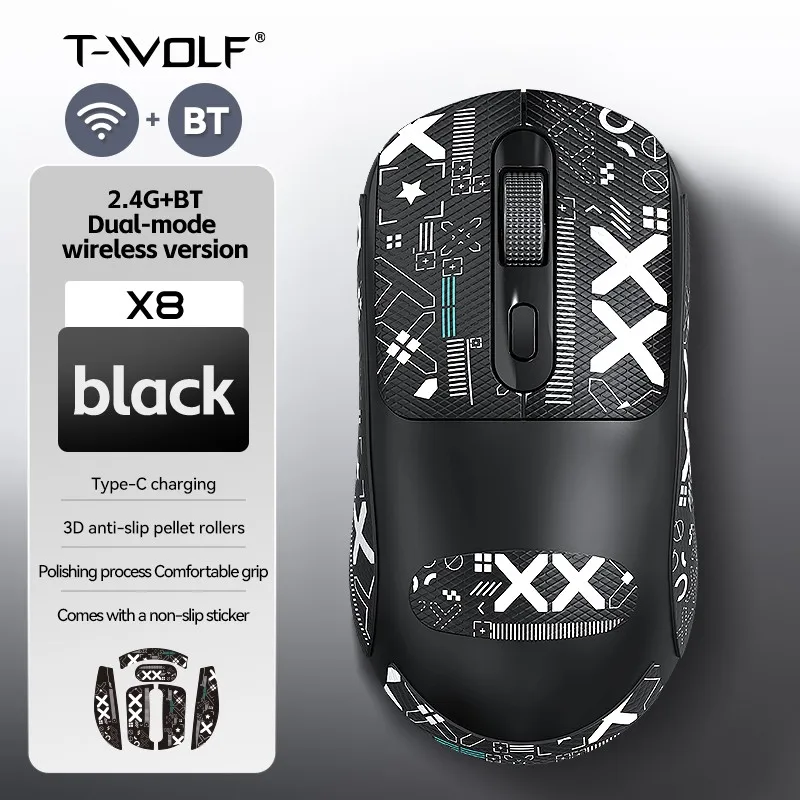 T-WOLF X8 Wireless Dual Mode Gaming Mouse Type-c Rechargeable Lightweight Anti-slip Stickers Suitable for Multiple Systems
