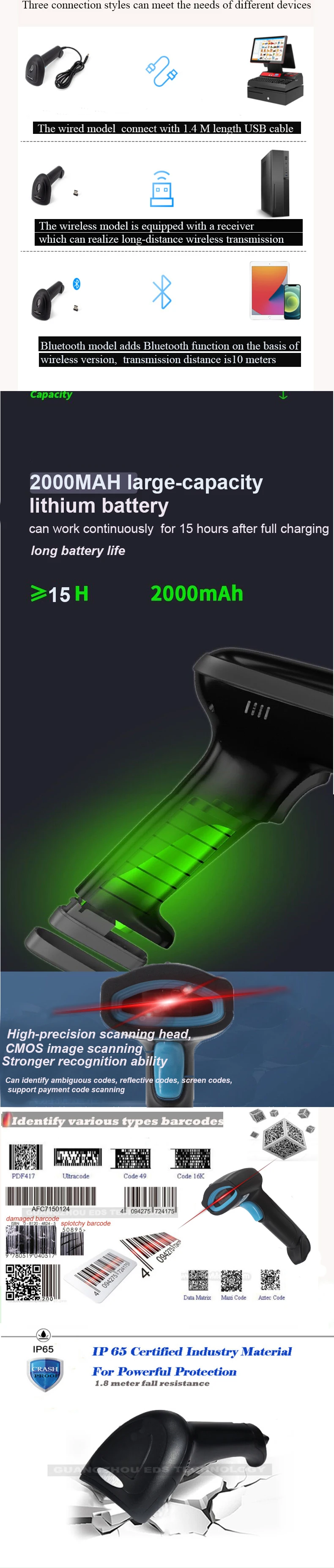 Wireless Barcode Scanner Handheld BT Scanner 1D 2D QR Code Scanning for Supermarket 2D Scanner