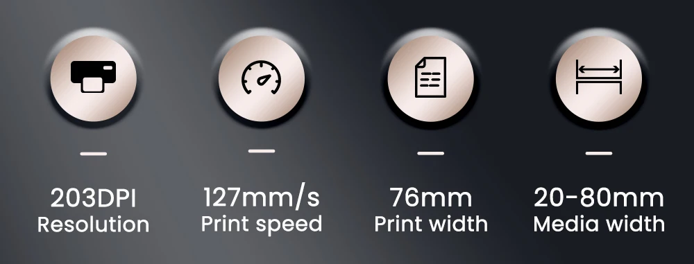 Max.Print Width:76 mm | Print Head Life:100km | Printing Method:Direct Thermal |